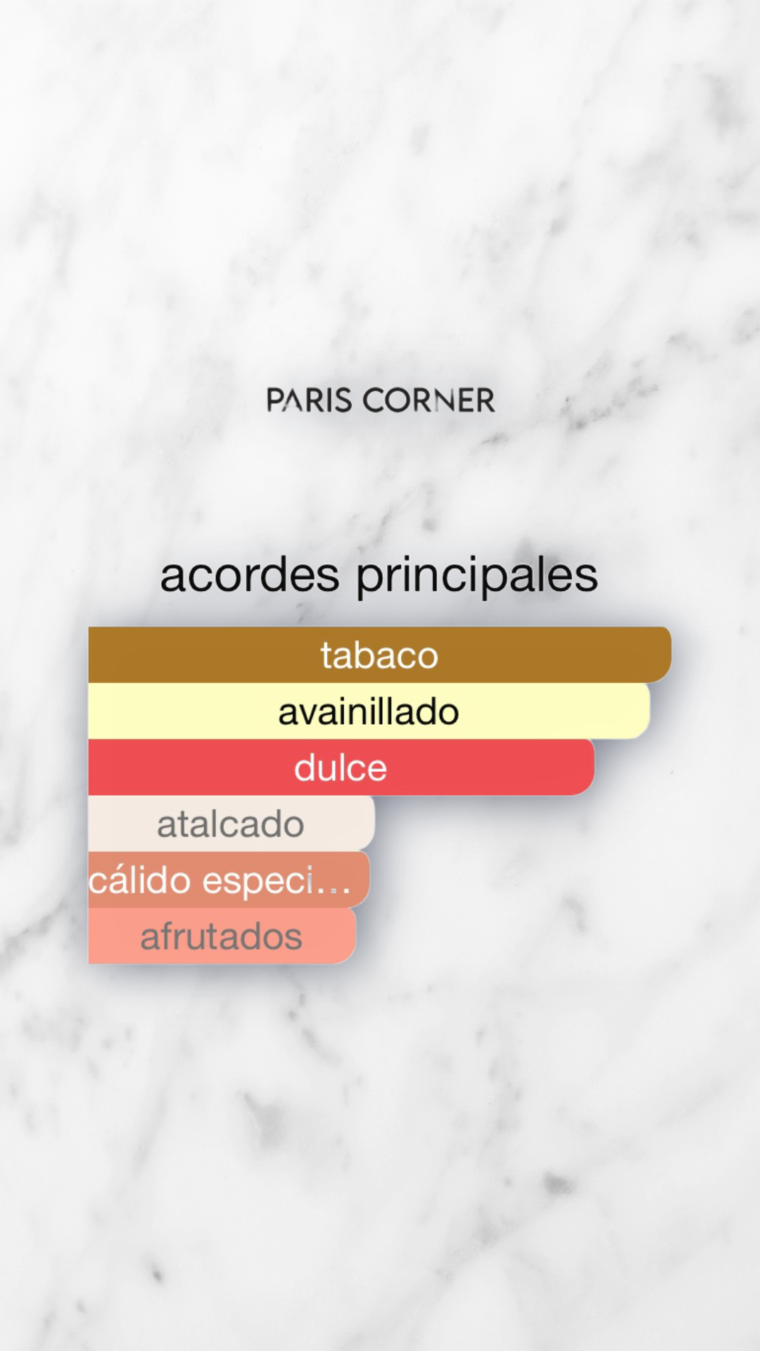 Notas de salida: hojas de tabaco y especias; corazón: vainilla cremosa, haba tonka, flor de tabaco; fondo: frutos secos y maderas.