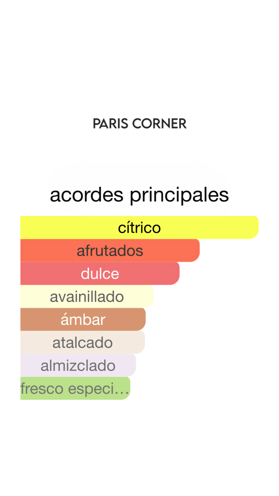 Se abre con un acorde vibrante y especiado que cautiva al primer instante, evoluciona hacia un corazón floral y amaderado lleno de carácter, y descansa sobre un fondo de ámbar y almizcle que envuelve la piel con una estela elegante, magnética y duradera.